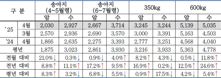 | □ 2025년 5월 1차(5.1. ~ 5.15.) 한우 가격 동향 |