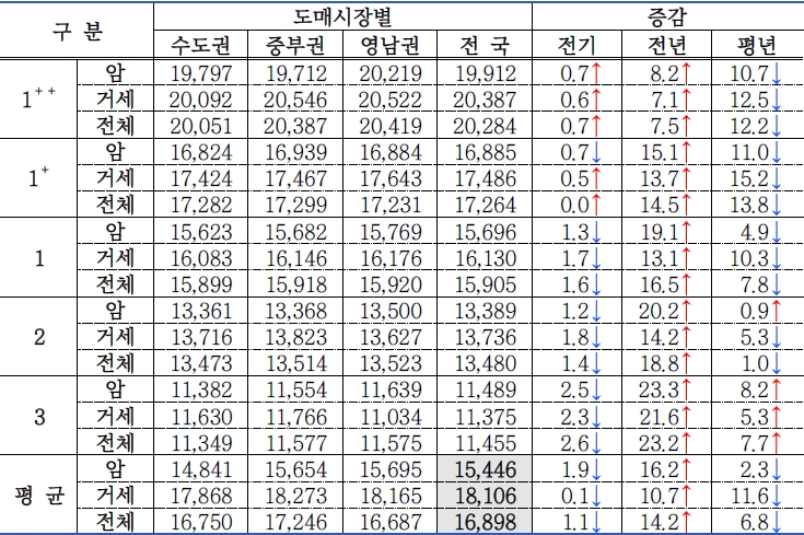 2) 전국은 호남권, 제주권도 포함. 평균에는 D등급 가격 제외.