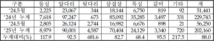 ❍ 올해 5월까지 누계수입량은 202.2천톤으로 전년대비 약 27.6천톤(12.0%) 감소하였고, 삼겹살이 14.7천톤(17.3%) 감소, 앞다리 7.2천톤(7.5%) 감소.