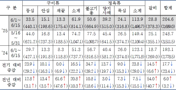 - 정육류 : 1,496.7톤[전기 대비 29.0%(612.8톤) 감소, 전년 대비 15.5%(275.1톤) 감소]