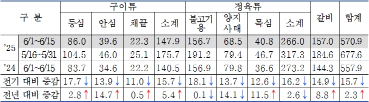 - 갈 비 : 8.5톤[전기 대비 20.9%(1.5톤) 증가, 전년 대비 17.6%(1.8톤) 감소]