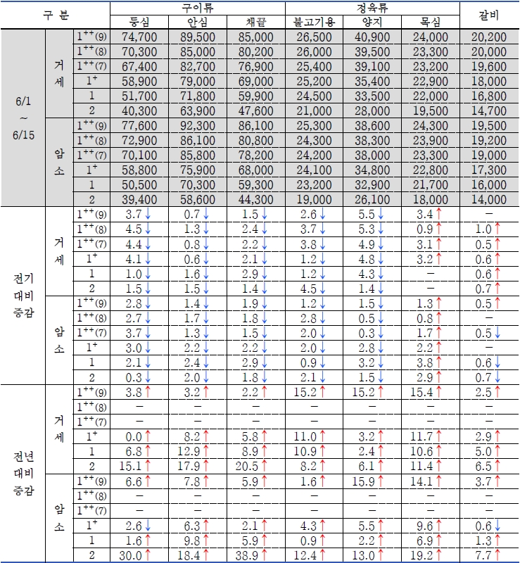 -전기 대비 가장 하락률이 큰 부위 : 거세우 1++(9)등급 양지(5.5% 하락), 암소 1등급 양지(3.2% 하락).