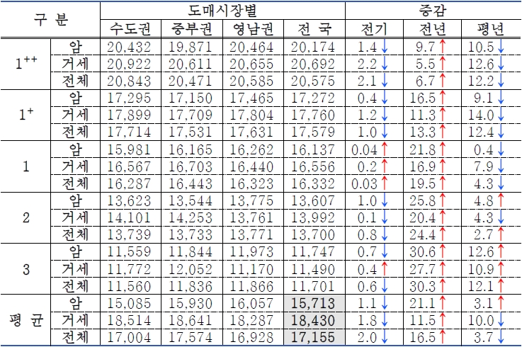 2) 전국은 호남권, 제주권도 포함. 평균에는 D등급 가격 제외.