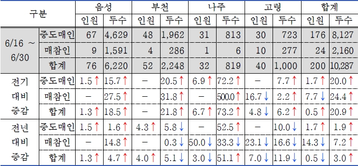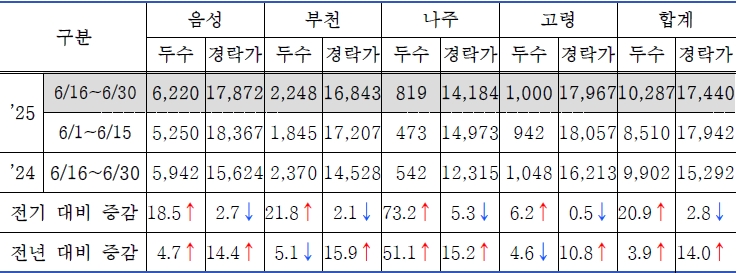 - 농협 4대 공판장 경락 마릿수는 10,287마리로 전기 대비 20.9%(1,777마리) 증가, 전년 대비 3.0%(298마리) 증가하였음.