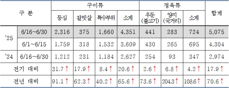 * 품목별 비중(전기 대비 / 전년 대비) : 구이류 82.5%(▲1.7% / ▼4.4%), 정육류 17.5%(▼1.7% / ▲4.4%)
