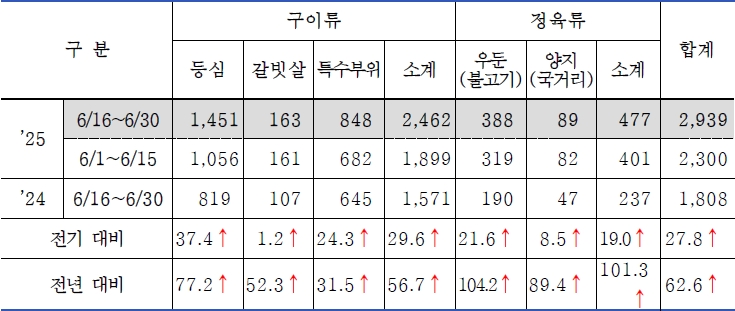 * 품목별 비중(전기 대비 / 전년 대비) : 구이류 83.8%(▲1.2% / ▼3.1%), 정육류 16.2%(▼1.2% / ▲3.1%)