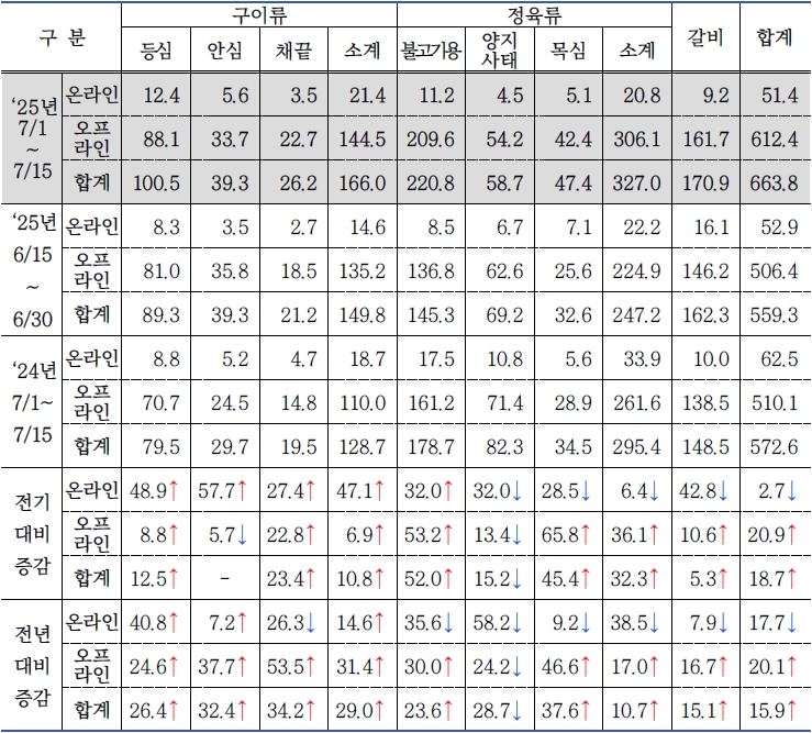 * 품목별 매입비중(전기 대비 / 전년 대비) : 구이류 25.0%(▼1.6% / ▼0.2%), 정육류 48.4%(▲2.5% / ▼1.2%), 갈비 26.6%(▼0.9% / ▲1.4%)