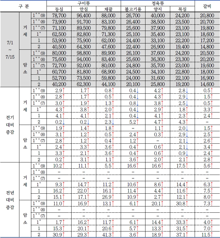 - 전기 대비 가장 하락률이 큰 부위 : 거세우 1++(8)등급 목심(2.9% 하락), 암소 1++(8)등급 목심(2.9% 하락).