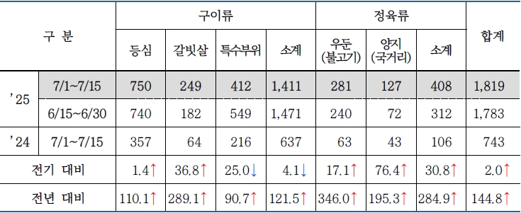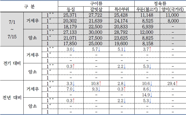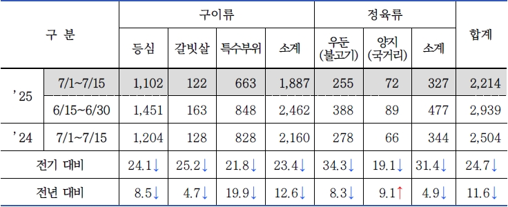 * 품목별 비중(전기 대비 / 전년 대비) : 구이류 85.2%(▲1.4% / ▼1.1%), 정육류 14.8%(▼1.4% / ▲1.1%)
