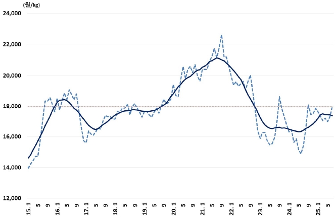 ■ 한우고기 도매가격은 2025년 1월 kg당 1만 7,608원에서 5월에 1만 6,986원으로 낮아졌으나 이후 상승세로 전환되었고, 7월에는 kg당 1만 8,013원으로 전월 대비 4.1%, 전년 동월 대비 16.8% 상승하였다.