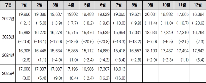 주: () 안은 전년 동월 대비 등락률(%)임.
