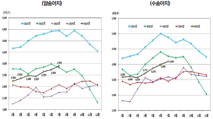 - 2025년 7월 암송아지 가격은 294만 3천 원으로 전월 대비 3.4%, 전년 동월 대비 19.9% 상승하였고, 수송아지 가격은 409만 2천 원으로 전월 대비 2.5%, 전년 동월 대비 18.5% 상승하였다.