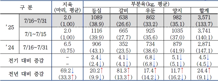 2) ’24.7. 식육판매장 조사대상 표본이 일부 변경됨(지육매입업소 축소 및 부분육 매입업소 확대)에 따라 조사대상 업체의 매입량 절대값 구간이 일부 조정됨.