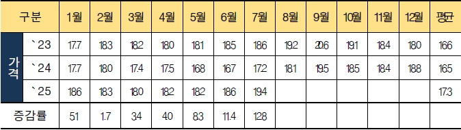 - 거세우 도매가격 : ('23.7.) 18.6천원/kg → ('24.7.) 17.2 → ('25.7.) 19.4