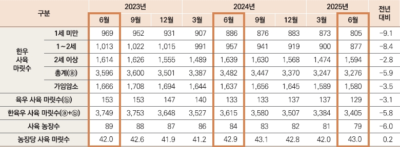 2) 2025년 6월은 통계청 「가축동향」에 발표된 잠정치이며, 1세 미만 및 전체 사육 마릿수는 추후 통계청 확정치 발표 시 증가할 수 있음.
