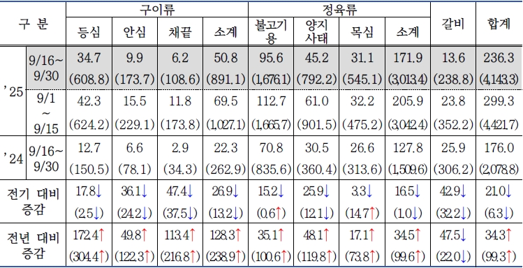 - 갈 비 : 234.1톤[전기 대비 0.6%(1.5톤) 증가, 전년 대비 86.0%(108.2톤) 증가]
