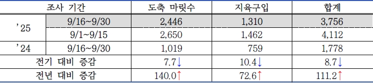 - '25년 9월 하순 한우 전체 등급판정 마릿수에서 조사대상 업체 10개소가 차지하는 비중 : 5.7%(전기 대비 1.1%감소, 전년 대비 2.8% 감소)