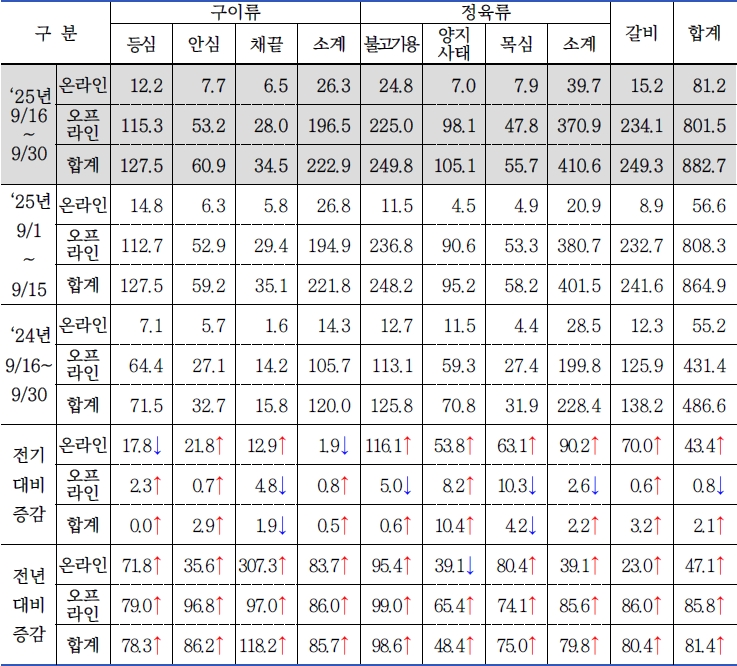 * 품목별 판매비중(전기 대비 / 전년 대비) : 구이류 24.5%(▲0.4% / 변동 없음), 정육류 46.3%(▼0.8% / ▼0.1%), 갈비 29.2%(▲0.4% / 변동 없음)