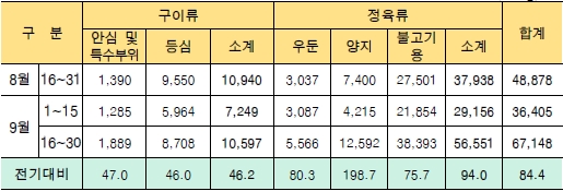 - 분석 : 추석 명절을 앞두고 전기 대비 모든 품목에서 수요 증가, 특히 명절에 주요 사용되는 정육류 소비 대폭 확대