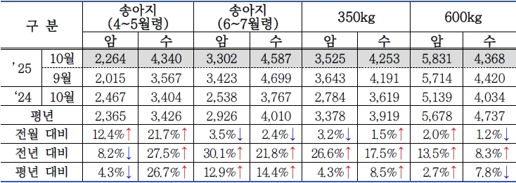| □ 2025년 10월 2차(10.16. ~ 10.31.) 한우 가격 동향 |