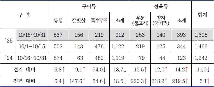 | 2025년 10월 2차(10.16. ~ 10.31.) 한우 식육판매장 동향 (1) | 2025.11.14 |