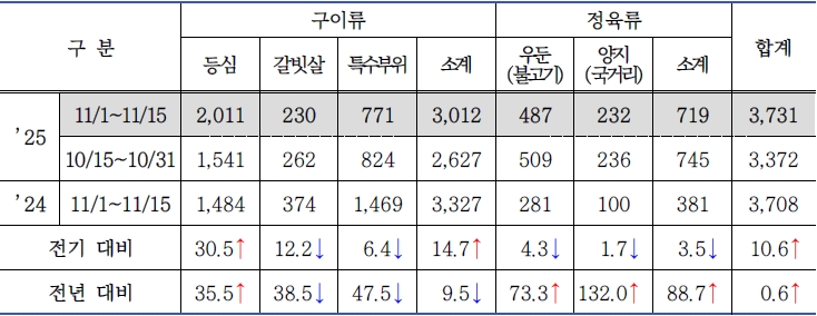 * 품목별 비중(전기 대비 / 전년 대비) : 구이류 80.7%(▲2.8% / ▼9.0%), 정육류 19.3%(▼2.8% / ▲9.0%)