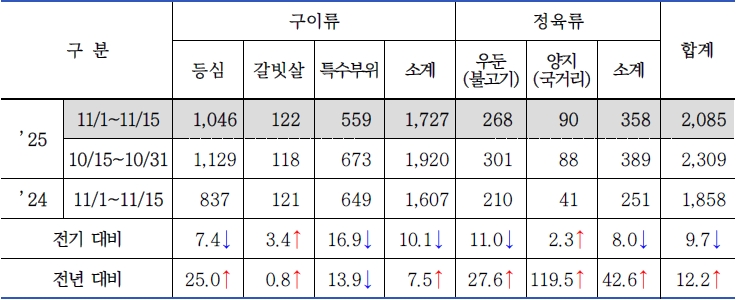 * 품목별 비중(전기 대비 / 전년 대비) : 구이류 74.2%(▲4.3% / ▼14.1%), 정육류 25.8%(▼4.3% / ▲14.1%)