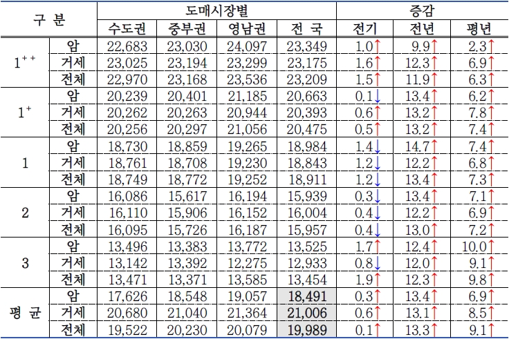 2) 전국은 호남권, 제주권도 포함. 평균에는 D등급 가격 제외.