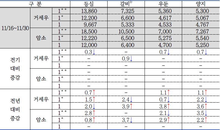 * 품목별 비중(전기 대비 / 전년 대비) : 등심 34.4%(▲0.1% / ▲4.1%), 갈비 19.5%(▼0.2% / ▲6.7%), 우둔 20.2%(▼0.2% / ▼7.0%), 양지 25.9%(▲0.3% / ▼3.8%)