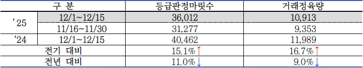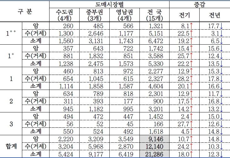 o 조사 기간 등급판정 마릿수는 36,012마리로 전기 대비 15.1%(4,735마리) 증가하였고, 전년 대비 11.0%(4,450마리) 감소하였음..
