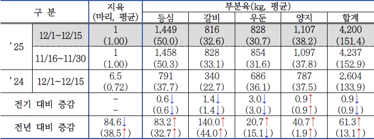 - 갈비 : 45kg[전기 대비 4.7%(2kg) 증가, 전년 대비 32.4%(11kg) 증가]