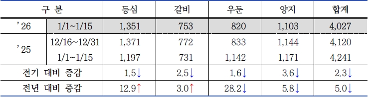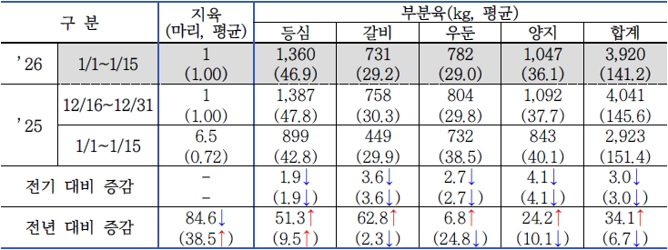 | □ 2026년 1월 1차(1.1. ~ 1.15.) 한우 식육판매장 동향 |