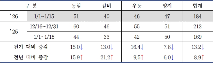 - 등심 : 51kg[전기 대비 15.0%(9kg) 감소, 전년 대비 15.9%(7kg) 증가]