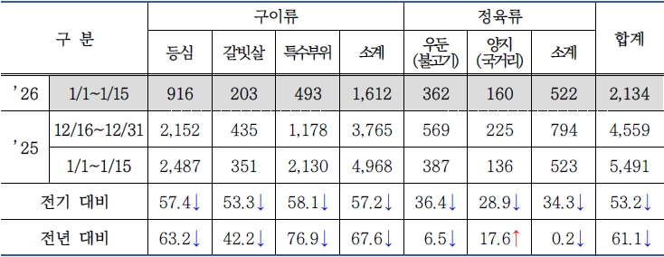 * 품목별 비중(전기 대비 / 전년 대비) : 구이류 75.8%(▲4.0% / ▼8.7%), 정육류 24.2%(▼4.0% / ▲8.7%)