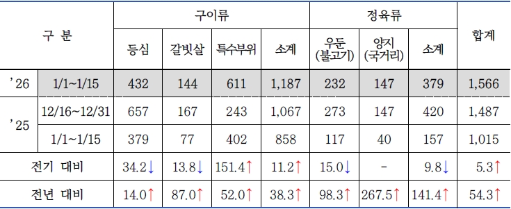 | 2026년 1월 1차(1.1. ~ 1.15.) 한우 식육판매장 동향 (0) | 2026.02.01 |