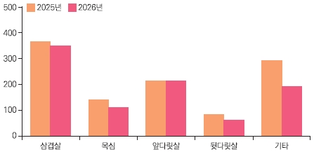 • (부위별) 전년 대비 삼겹살 4.7% ↓, 목심 20.0% ↓, 앞다릿살 0.8% ↑, 뒷다릿살 24.9% ↓