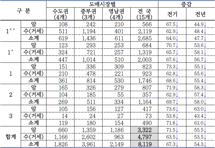 o 조사 기간 등급판정 마릿수는 14,869마리로 전기 대비 65.3%(28,000마리) 감소하였고, 전년 대비 55.1%(18,266마리) 감소하였음.