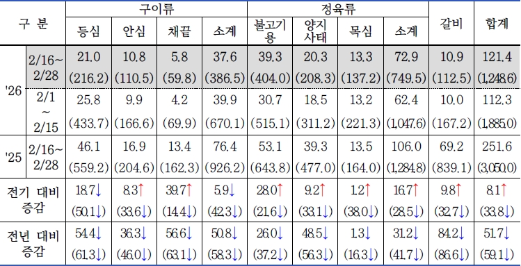 | 2026년 2월 2차(2.16. ~ 2.28.) 한우 식육판매장 동향 (0) | 2026.03.17 |