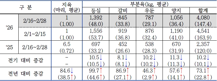 | □ 2026년 2월 2차(2.16. ~ 2.28.) 한우 식육판매장 동향 |