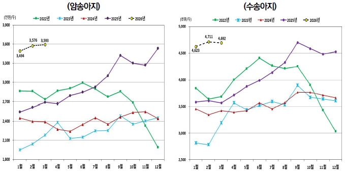 - 한우고기 도매가격이 상승함에 따라 송아지 가격도 상승하여 2026년 3월 1∼5일 기준 암송아지 가격은 359만 원으로 전년 동월 대비 33.6% 높고, 수송아지 가격은 469만 원으로 전년 동월 대비 31.4% 높다.