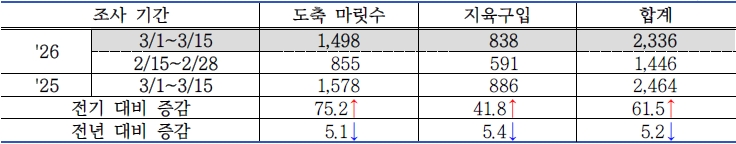 | 2026년 3월 1차(3.1. ~ 3.15.) 농협 4대 공판장 한우 수요 동향 및 전망 (0) | 2026.04.06 |