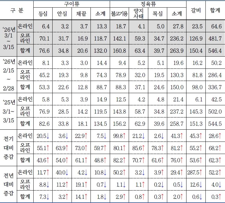- 정육류 : 288.7톤[전기 대비 75.2%(123.9톤) 증가, 전년 대비 10.1%(26.5톤) 증가]